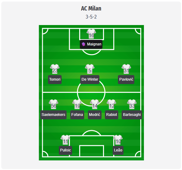 AC Milan ar putea juca într-un 3 5 2, chiar dacă în acest moment este doar o prognoză. Maignan este așteptat în poartă, în spatele lui Tomori, De Winter și Pavlović. Saelemaekers și Bartesaghi ar asigura lățimea pe aripi din rolul de wingback, într-o formație care pare concepută pentru compactitate în centru. Cele mai importante indicii pentru selecție vin din absențe. Gabbia lipsește, ceea ce sugerează că De Winter va completa linia de trei alături de Tomori și Pavlović, iar accidentarea lui Loftus Cheek ar putea duce la formarea unui trio de mijlocași format din Fofana, Modrić și Rabiot. Mai în față se află perechea prevăzută Pulisic și Leão, adică un duo mobil în atac, în loc de un sistem cu un atacant fix.