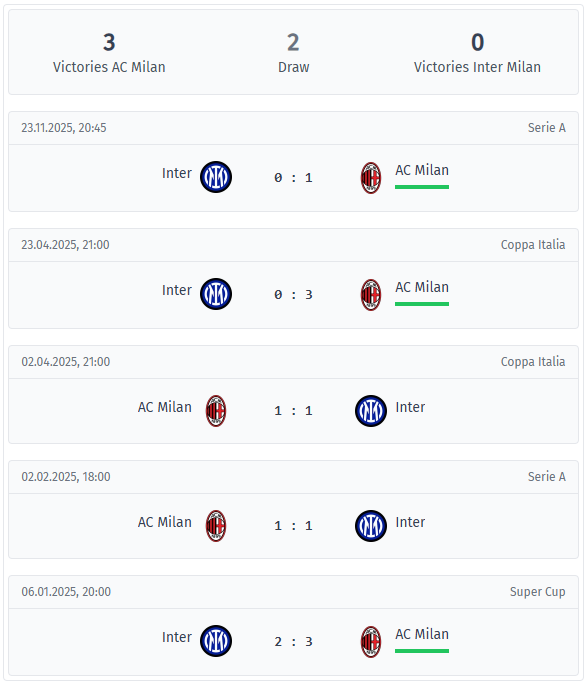 Bilanțul recent al derby-urilor este clar în favoarea AC Milano. Rossoneri sunt neînvinși în ultimele cinci dueluri, cu trei victorii și două egaluri, Inter Milano rămânând fără succes în această serie.