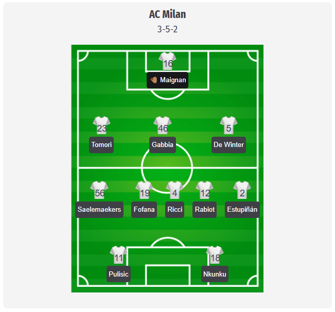 Allegri ar putea miza pe o linie de trei fundași la Milan, cu Maignan în spatele lui Tomori, Gabbia și De Winter. Saelemaekers și Estupiñán ar trebui să asigure lățimea ca mijlocași laterali, în timp ce Fofana, Ricci și Rabiot vor forma centrul. În atac, prognoza îl vede pe Pulisic aproape de Nkunku, cu planul clar de a intra devreme în careul de pedeapsă. Două absențe continuă să dicteze cadrul. Pavlović lipsește din cauza unei leziuni la cap, așa că linia de trei fundași va rămâne probabil așa cum am descris mai sus, iar Gimenez este în continuare indisponibil pe termen lung după o operație la gleznă. Füllkrug va rata acest meci din cauza unei fracturi la degetul mare, ceea ce i-ar putea oferi lui Leão minute de joc de pe banca de rezerve. Din punct de vedere tactic, echipa lui Allegri ar trebui să rămână compactă, să preseze în funcție de situație și să se bazeze pe sprinturile lui Rabiot și siguranța lui Maignan.