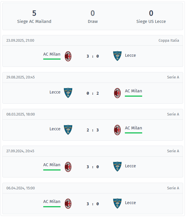 În ultimele cinci dueluri, AC Milan a câștigat de cinci ori împotriva US Lecce, fără niciun egal. Cel mai recent meci a fost în septembrie 2025, în Coppa Italia, o victorie cu 3-0, după ce în august 2025, în campionat, se înregistrase deja un 2-0 în deplasare. În Serie A, meciul din martie 2025 s-a terminat cu 3-2, iar ambele meciuri din 2024 s-au terminat cu 3-0. Această serie pare a fi un semn clar de control. Milan a marcat 14 goluri și a primit doar 2, plus patru meciuri fără gol primit. Lecce nu a marcat în patru din cinci meciuri, iar fiecare întâlnire a avut peste 1,5 goluri în total. Patru din cinci au depășit 2,5, inclusiv o serie de trei cu 3-0, 3-0, 3-2 din 2024 până în martie 2025. Interesant este că singura după-amiază în care Lecce a ținut cu adevărat pasul, a fost în martie 2025, cu două goluri, dar totuși a pierdut cu 2-3. În rest, Milan a continuat să marcheze după pauză și a câștigat repriza a doua în patru din aceste cinci dueluri. Este foarte posibil ca Lecce să aibă cea mai bună șansă de a fi la egalitate la pauză, deoarece cei care au fost conduși în acest duel au văzut, de cele mai multe ori, cum Milan a marcat goluri suplimentare. Pentru următorul capitol, lista disponibilității contează mai mult decât nostalgia, Pavlović și Gimenez lipsesc în prezent de la Milan, Camarda de la Lecce. Cu toate acestea, imaginea directă este destul de clară, Milan a câștigat cinci meciuri consecutive împotriva lui Lecce, a marcat în toate cele cinci, iar Lecce nu a reușit nici măcar o remiză în acest eșantion.
