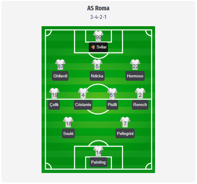 Roma ar putea miza din nou pe un 3-4-2-1, deși aceasta este mai degrabă o previziune decât o formație confirmată. Mile Svilar – 99 va sta probabil între buturi, în spatele lui Daniele Ghilardi – 87, Evan Ndicka – 5 și Mario Hermoso – 22. Zeki Çelik – 19 și Devyne Rensch – 2 ar trebui să ofere sistemului lățimea necesară.