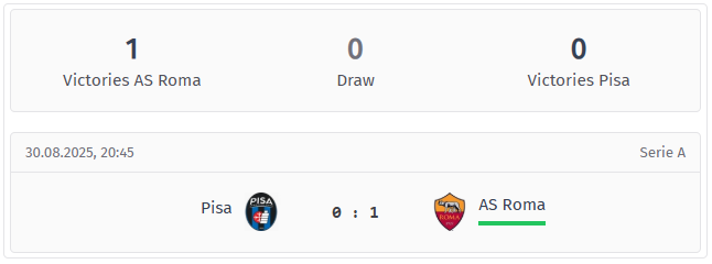 Singura confruntare recentă a avut loc în august 2025, când Roma a câștigat cu 1-0 la Pisa. Meciul era încă fără goluri la pauză și s-a decis abia în repriza a doua, ceea ce se potrivește în mare măsură cu datele actuale, care arată că Roma este o echipă mai puternică în dueluri după pauză. Totuși, un singur meci este o bază subțire, așa că cel mai probabil se poate afirma: Pisa a ținut piept cel puțin o vreme.