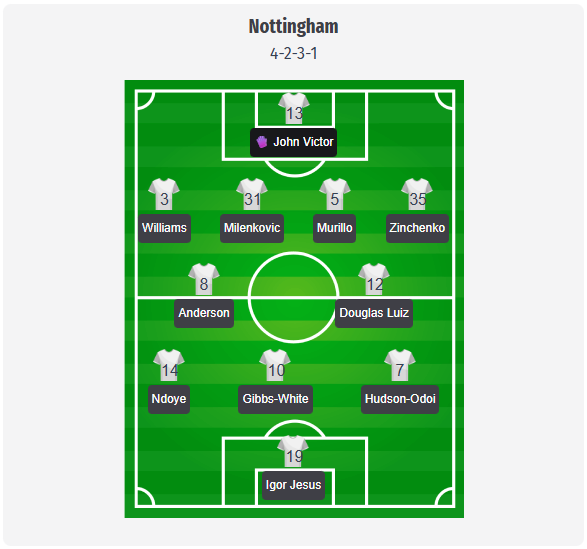 La Nottingham Forest, se așteaptă ca Dyche să rămână la 4-2-3-1, iar prognoza noastră este în consecință, cu Victor în poartă, în spatele unei apărări cu patru jucători formată din Williams, Milenkovic, Murillo și Zinchenko. Anderson și Douglas Luiz vor asigura mijlocul terenului, Anderson conducând pressingul și schimbările de joc, Gibbs-White preluând rolul de număr 10, flancat de Ndoye și Hudson-Odoi, cu Jesus în centrul atacului. Dyche ar putea face unele schimbări în componența echipei, dar formația de bază ar trebui să rămână similară. Accidentările și absențele marchează această echipă prevăzută, Ndoye fiind incert din cauza unei probleme la gambă, astfel încât Bakwa sau Hutchinson ar putea fi folosiți pe aripi. Aina este o opțiune și oferă o alternativă suplimentară pe postul de fundaș lateral, chiar dacă în pronosticul nostru Williams își păstrează locul. Boly și Sangaré sunt la naționalele lor, Yates nu este disponibil, iar operația la genunchi a lui Woods îi lasă pe Jesus, Awoniyi și Kalimuendo ca opțiuni pentru vârf.