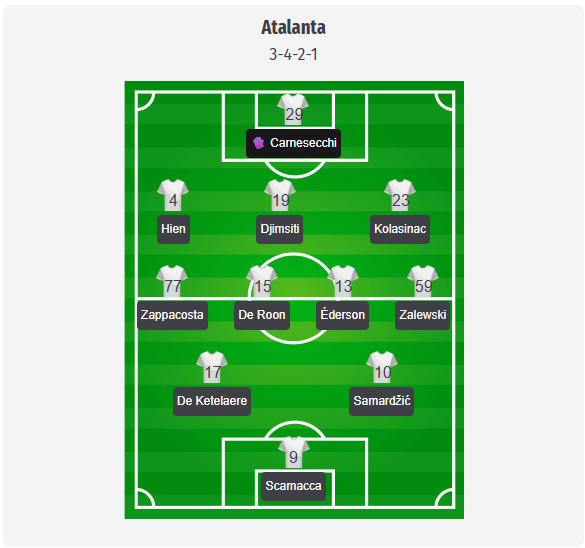 Interesant este că se așteaptă ca Atalanta să rămână la formația 3-4-2-1 folosită împotriva lui Inter, așa că echipa noastră de start prevăzută este Carnesecchi în poartă, cu Hien, Djimsiti și Kolasinac în fața lui. Zappacosta, care și-a revenit complet, ar trebui să înceapă pe partea dreaptă, cu Zalewski probabil pe stânga, în timp ce De Roon și Ederson vor asigura mijlocul terenului. De Ketelaere și Samardžić vor fi probabil alături de Scamacca. Există încă incertitudine, deoarece Scalvini ar putea fi preferat în locul lui Djimsiti în linia de trei fundași, iar Sulemana sau Pašalić ar putea concura cu Samardžić pentru un loc în spatele lui Scamacca. Lookman și Kossounou sunt la națională, în timp ce Bellanova și Bakker sunt accidentați, ceea ce reduce puțin adâncimea pe aripi și în apărare, așa că aceasta trebuie considerată doar o formație prevăzută, nu una oficială.