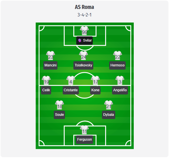 AS Roma va rămâne probabil la formația 3-4-2-1 în formația noastră preconizată, cu Svilar în poartă, în spatele unei linii de trei formate din Mancini, Ziolkowski și Hermoso. Çelik și Angeliño ar trebui să asigure lățimea ca fundași laterali, în timp ce Cristante și Koné vor juca în interior. În fața lor, Soulé și Dybala îl vor susține probabil pe Ferguson, singurul atacant dintre linii. Acest sistem este doar o proiecție, este posibil ca Gasperini să schimbe deciziile privind personalul pe termen scurt, mai ales că Ndicka și El Aynaoui sunt plecați cu echipele naționale, iar Bove este în continuare indisponibil din cauza problemelor cardiace. Deoarece Pellegrini se confruntă încă cu o accidentare la coapsă, responsabilitatea creativă în echipa noastră preconizată revine și mai mult lui Dybala și Soulé, Ferguson fiind persoana centrală de referință.