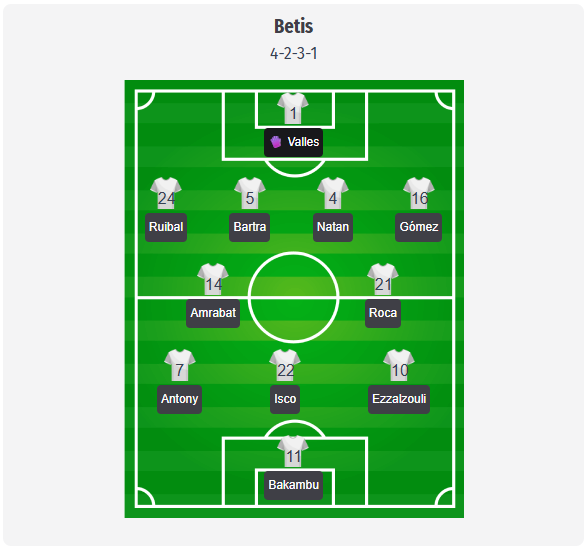 Betis abordează acest meci cu cel mai bun rezultat din ultimele săptămâni: o victorie cu 3-2 în campionat la Girona. Mai important decât rezultatul a fost modul în care echipa a revenit de două ori și a marcat golul victoriei prin Rodrigo Riquelme, după ce Isco a intrat pe teren. Abde Ezzalzouli a fost piesa centrală a acestei reveniri, marcând o dată și oferind două pase decisive. Acest lucru a conferit echipei Betis o eficacitate ofensivă care lipsise în ultima perioadă.