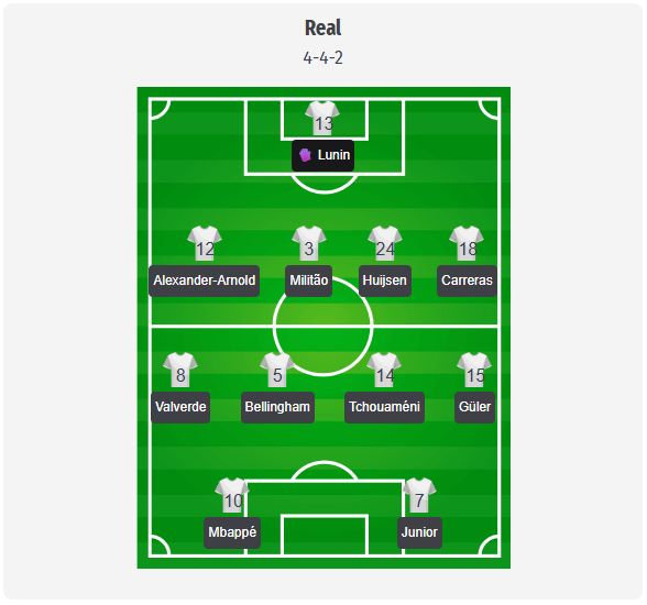 În toate competițiile, Real a înregistrat o victorie, un egal și trei înfrângeri în ultimele cinci meciuri, inclusiv două eșecuri împotriva Bayernului, care au însemnat eliminarea din Liga Campionilor. În fiecare dintre aceste meciuri au marcat, ceea ce explică încrederea caselor de pariuri. Dar în fiecare au și primit goluri. Cu Thibaut Courtois și Rodrygo accidentați și Jude Bellingham încă utilizat cu precauție, echipa lui Arbeloa călătorește cu jucători de clasă în lot, dar cu o certitudine limitată.