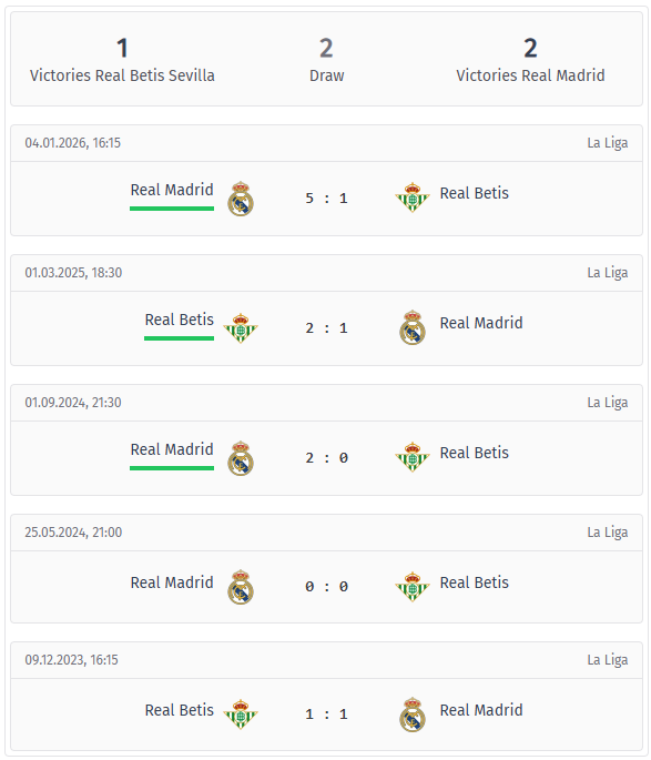 Ultimele cinci întâlniri nu au fost deloc dezechilibrate, chiar dacă rezultatul cel mai recent ar putea da o altă impresie. Real conduce bilanțul cu două victorii împotriva uneia a lui Betis, la care se adaugă două egaluri. Meciul de campionat din ianuarie 2026 de pe Bernabéu iese în evidență: o victorie acasă cu 5-1. Înainte de asta, Betis învinsese Real cu 2-1 în 2025, ceea ce face ca această confruntare să nu fie deloc una previzibilă.