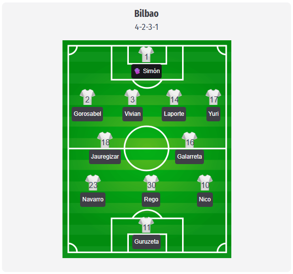 La Athletic Bilbao, este de așteptat ca Ernesto Valverde să rămână la formația obișnuită 4-2-3-1, chiar dacă situația personalului în atac este tensionată. Iñaki Williams este în continuare indisponibil din cauza unor probleme la aductori, iar Robert Navarro se confruntă cu o accidentare la gleznă. În apărarea centrală, se preconizează că duo-ul Laporte și Vivian va începe, iar Nico Williams va aduce viteză și profunzime pe partea stângă. În centrul atacului, Guruzeta ar trebui să preia rolul de număr nouă, iar în spatele său, Berenguer sau Rego sunt candidați pentru poziția centrală. Varianta pe care Valverde o va alege în cele din urmă va fi dezvăluită abia odată cu anunțarea oficială a echipei de start.