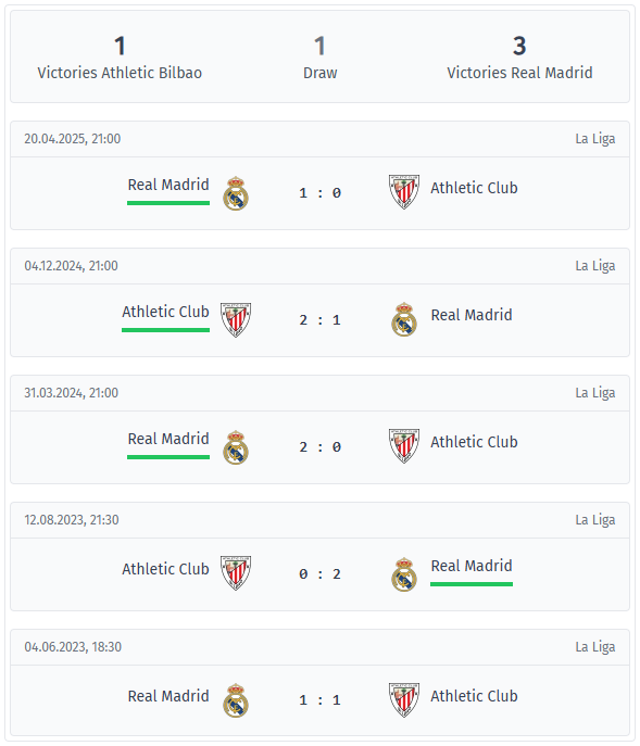 În ultimele cinci confruntări directe dintre Athletic Club și Real Madrid, Real a câștigat de trei ori, Athletic a câștigat o dată, iar un alt meci s-a încheiat la egalitate. Real a marcat în toate cele cinci meciuri, iar Athletic a primit cel puțin un gol în fiecare dintre ele. Rezultatele au fost în general strânse, în trei dintre aceste cinci întâlniri echipele rămânând sub 2,5 goluri și niciodată nu s-au marcat mai mult de trei goluri. Athletic s-a dovedit a fi competitivă în special pe San Mamés, unde a obținut o victorie cu 2-1 în decembrie 2024, în timp ce Real a câștigat cu 1-0 în meciul retur din aprilie 2025, la Madrid. Meciurile au fost, în general, strânse și disputate.