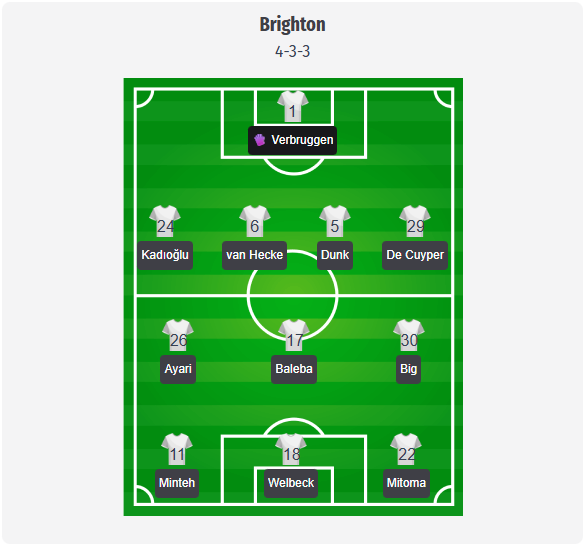Hürzeler va păstra probabil formația obișnuită 4-3-3 a lui Brighton, cu Verbruggen în spatele unei linii de patru formate din Kadioglu, van Hecke, Dunk și De Cuyper. Deoarece Webster este în continuare indisponibil, perechea de fundași centrali pare relativ clară, deși Boscagli sau Igor ar putea fi prima opțiune ca înlocuitori. Poziția de fundaș dreapta este cea care trebuie urmărită, deoarece Veltman s-a confruntat recent cu o problemă la genunchi. La mijlocul terenului, Ayari, Baleba și Groß sunt probabil trio-ul titular, iar interesul recent pentru transferul lui Ayari nu va schimba probabil formația. În atac, Minteh și Mitoma ar trebui să joace alături de Welbeck, March nu este disponibil, iar Tzimas este indisponibil pe termen lung. Dacă Hürzeler dorește mai multă rotație între linii, Rutter ar putea intra fără a schimba formația de bază.