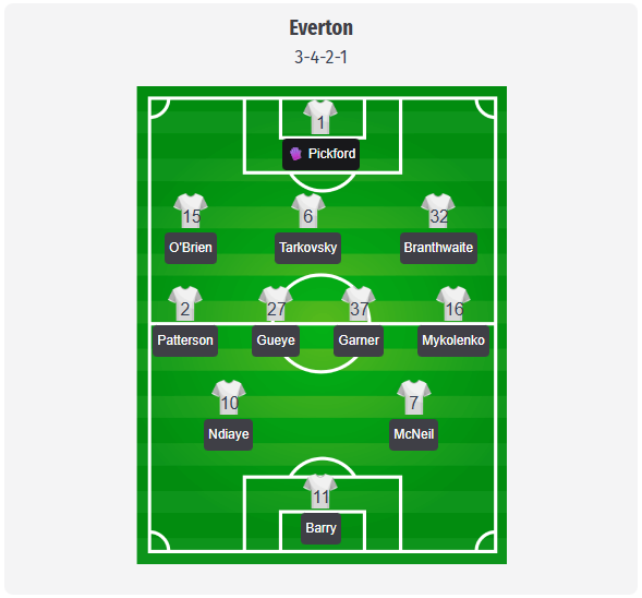 Moyes va rămâne probabil la formația 3 4 2 1 pe care a mizat în ultima perioadă, cu Pickford în spatele unei linii de trei formate din O’Brien, Tarkowski și Branthwaite. Formația ar trebui să se prezinte uneori ca o linie flexibilă de cinci, cu Patterson împins în sus ca fundaș dreapta și Mykolenko menținând linia mai stabilă pe stânga, în timp ce Branthwaite susține începutul atacului cu pasele sale. La mijlocul terenului, Gueye și Garner par a fi cei mai probabili dublu șase, mai ales că Dewsbury Hall lipsește și Alcaraz este incert. În fața lor, Ndiaye și McNeil sunt probabil jucătorii de legătură, care se retrag în interior pentru a lega jocul și a presa, iar Barry este preferat să conducă atacul, după recentele sale goluri. Beto ar putea fi o opțiune târzie, în timp ce Grealish rămâne indisponibil din cauza unei accidentări la picior.