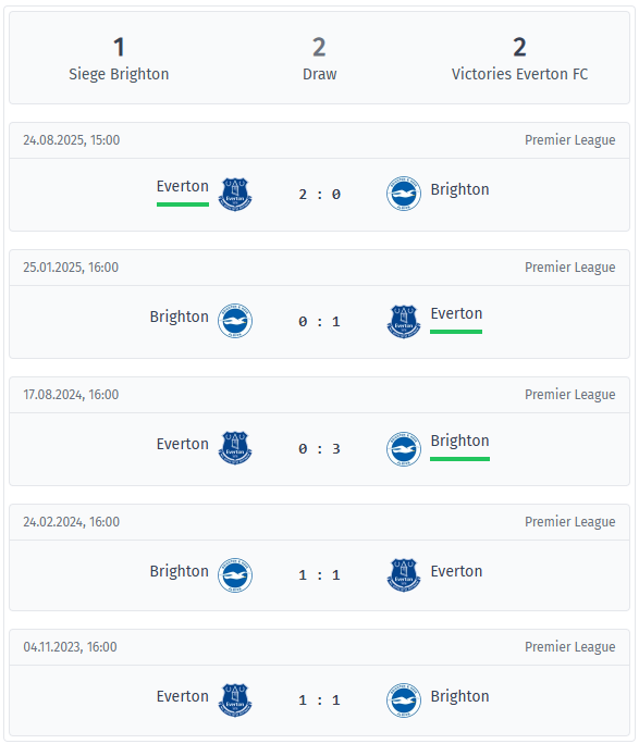 În ultimele cinci dueluri din ligă, Everton are avantajul, cu două victorii față de una a lui Brighton, plus două egaluri. Cel mai recent meci a avut loc în august 2025, Everton 2-0 Brighton, iar la începutul anului 2025, Everton a câștigat cu 1-0 în deplasare. Cea mai puternică reacție a lui Brighton a fost victoria cu 3-0 în deplasare în 2024, alături de egalurile 1-1 din 2024 și 2023, astfel încât niciuna dintre echipe nu a transformat întâlnirile într-un schimb deschis de lovituri. Golurile au fost marcate într-un interval strâns. Toate cele cinci meciuri din ultimele partide au rămas sub 3,5 goluri, iar patru dintre ele sub 2,5. Cu toate acestea, meciurile au fost rareori complet fără goluri, trei întâlniri depășind 1,5 goluri. Scorul de 0-3 din 2024 este o excepție în ceea ce privește numărul de goluri, restul meciurilor fiind decise de momente izolate sau fiind echilibrate. Interesant este că fazele inițiale au fost rezervate. Prima repriză a rămas sub 1,5 goluri în toate cele cinci meciuri, un model clar în cinci meciuri. Când Brighton a făcut rău lui Everton, acest lucru s-a întâmplat adesea după pauză. Între 2023 și 2024, au marcat în trei meciuri consecutive în repriza a doua, iar Everton a primit goluri în repriza a doua în trei meciuri în aceeași perioadă. Deoarece rezultatele în această confruntare sunt de obicei strânse, disponibilitatea poate fi mai importantă decât de obicei. Brighton joacă fără Webster, iar March și Tzimas sunt și ei absenți, ceea ce ar putea limita opțiunile lui Hürzeler în zone importante. Din lotul lui Everton lipsesc Dewsbury Hall, Alcaraz și Grealish. Având în vedere tendința de lungă durată de a marca puține goluri în prima repriză, o fază inițială prudentă s-ar înscrie din nou în modelul recent.
