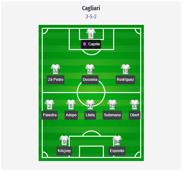 Pisacane ar trebui să rămână la Cagliari cu un 3-5-2, cu Caprile din nou ca probabil numărul unu după recentele sale fapte eroice. Linia de trei prevăzută este formată din Zé Pedro, Dossena și Rodríguez, susținuți de un trio compact de mijlocași format din Adopo, Liteta și Sulemana. Palestra și Obert ar trebui să asigure lățimea ca fundași laterali, în timp ce Kılıçsoy va juca în față alături de Esposito, unul mergând în adâncime, celălalt lăsându-se în spate și conectând acțiunile. Accidentările ar putea totuși influența decizia finală. Deiola, Mazzitelli și Gaetano ar putea fi indisponibili, ceea ce înseamnă că vor exista mai puține opțiuni naturale de rotație în centru, iar Felici și Belotti vor lipsi în continuare în atac. Dacă Pisacane dorește mai multă forță între linii, Folorunsho, care revine după o lungă pauză, pare a fi cea mai evidentă opțiune pentru a schimba jocul. Mina și Zappa oferă o protecție suplimentară în ultima linie.