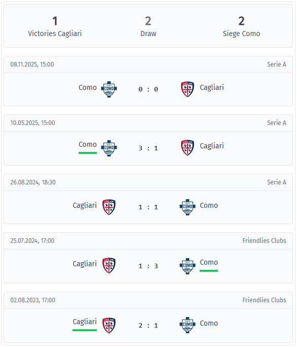 Cagliari – Como Comparație directă și statistici