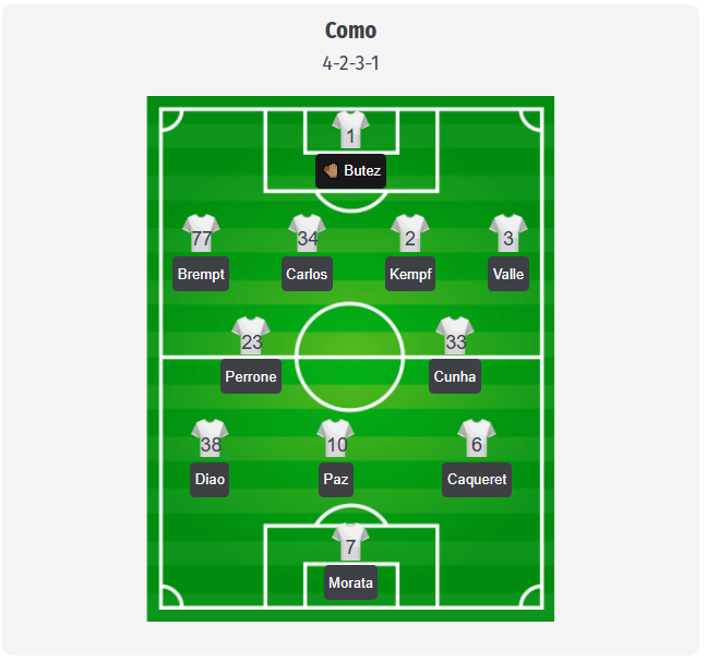 Mai în față, formația așteptată se bazează pe Nico Paz – 10 între linii și Álvaro Morata – 7 ca atacant de referință. Assane Diao – 38 și Maxence Caqueret – 6 ar trebui să fie jucătorii de sprijin probabili, mai ales că Adrian Lahdo, Jesús Rodríguez și Jayden Addai nu sunt disponibili, iar Como este astfel puțin subțire pe pozițiile laterale.