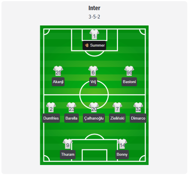 Inter ar trebui să alinieze, ca de obicei, într-un sistem 3-5-2: Yann Sommer în poartă, în spatele unei linii de trei formată din Manuel Akanji, Stefan de Vrij și Alessandro Bastoni. Yann Bisseck este în continuare absent, ceea ce face ca linia defensivă să ofere în continuare stabilitate și să permită jocul pe centru.
