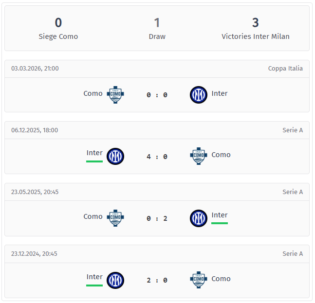 Ultimele patru confruntări vorbesc clar în favoarea lui Inter. După o victorie cu 2-0 în 2024, a urmat un alt 2-0 în mai 2025 și un clar 4-0 în decembrie 2025, înainte ca Como să impună un 0-0 în semifinala Coppa Italia din martie 2026. Acest egal a pus capăt seriei de victorii, dar nu a schimbat cu nimic imaginea de ansamblu: Inter a dominat clar această pereche în ultima perioadă.