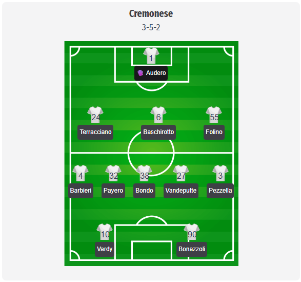 Cremonese ar trebui să rămână la formația 3-5-2 preferată de Nicola, astfel încât echipa probabilă îl va avea pe Audero în poartă, o linie de trei fundași cu Terracciano, Baschirotto și Folino, precum și Barbieri și Pezzella ca fundași laterali. La mijlocul terenului, Payero, Bondo și Vandeputte ar trebui să joace în centru, în timp ce Vardy și Bonazzoli sunt prevăzuți ca duo de atac, care ar trebui să tragă Cagliari în verticală. Rămâne o prognoză, nu o formație oficială, iar Nicola poate încă face modificări. Singura absență notabilă este Collocolo, care lipsește din cauza unei probleme la mușchii coapsei, astfel încât Bondo și Payero sunt principalii candidați pentru primul unsprezece în centru. De pe bancă, Grassi, Valoti, Sanabria și Okereke se remarcă ca alternative naturale în mijlocul terenului și în atac, în cazul în care antrenorul alege alte soluții.
