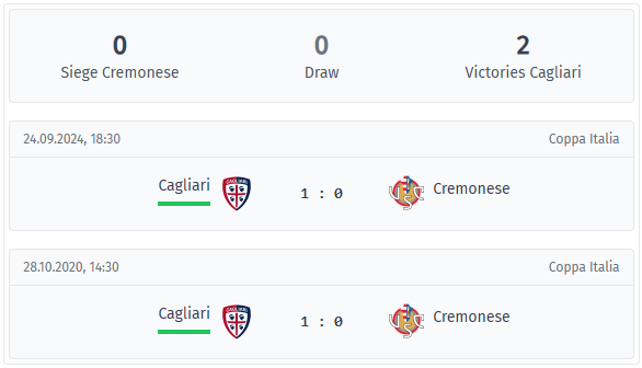 În ultimele două întâlniri, ambele în Coppa Italia, Cagliari a obținut victorii strânse cu 1-0 pe teren propriu, în 2024 și 2020. În aceste dueluri, Cremonese nu a condus niciodată, nu a marcat niciun gol, iar ambele meciuri s-au decis abia după pauză. Statistic, eșantionul este mic, dar sugerează că Cagliari se descurcă mai bine în aceste meciuri de cupă cu un singur gol. Ambele partide au început prudent, scorul la pauză fiind 0-0. Toate golurile au fost marcate de Cagliari în repriza a doua, ceea ce corespunde datelor care arată că 100% din goluri și rezultatele decisive au fost obținute după pauză. Din punct de vedere tactic, acest lucru sugerează că Cremonese poate ține pasul la începutul meciului, dar întâmpină probleme de îndată ce Cagliari accelerează ritmul. Per ansamblu, imaginea este clar în favoarea Cagliarului: două victorii din două, două meciuri fără goluri primite și niciodată mai mult de un gol în total într-unul dintre meciuri. Este posibil ca contextul cupei și avantajul terenului propriu al Cagliarului să fi jucat un rol, astfel încât un meci de campionat la Cremona ar putea avea un alt curs, mai ales dacă Cremonese va marca în sfârșit un gol.