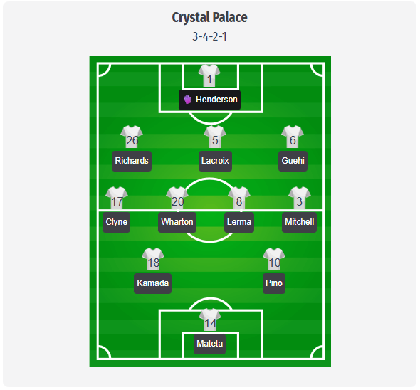 Palace ar trebui să rămână la formația 3-4-2-1, cu Henderson în poartă, în spatele unei linii de trei formate din Richards, Lacroix și Guehi. Clyne și Mitchell ar trebui să asigure lățimea necesară, în timp ce Wharton și Lerma controlează spațiile centrale. Kamada și Pino vor juca probabil între linii, în spatele lui Mateta, o formație care menține Palace compactă, fără a sacrifica capacitatea de a avansa rapid. Deoarece Muñoz este în continuare indisponibil după o operație la genunchi, iar Riad și Kporha nu sunt încă apți de joc, Clyne pare a fi alegerea naturală pentru postul de titular pe partea dreaptă. Sarr și Mateta ar trebui să fie disponibili, astfel încât Sarr ar putea să-i provoace pe Pino sau Kamada, în cazul în care Glasner dorește mai multă viteză directă. În Europa, Doucouré și Ahamada nu sunt încă eligibili, ceea ce sugerează din nou prezența lui Wharton și Lerma în mijlocul terenului. Este vorba doar de o prognoză a echipei de start, nu de o formație confirmată.