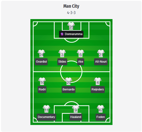 Se așteaptă ca City să rămână la familiarul 4 3 3, așa că îl văd pe Donnarumma în poartă, în fața lui o linie de patru cu Gvardiol, Dias, Ake și Aït Nouri. Rodri va prelua rolul de mijlocaș defensiv, cu Bernardo și Reijnders în fața lui, iar în atac, Doku și Foden ar trebui să-l flancheze pe Haaland, pentru a echilibra pericolul direct pe aripi cu retragerea lui Foden în centru. Stones ar putea lipsi în continuare după recentele probleme la picior, astfel încât Dias și Gvardiol vor forma din nou perechea naturală de fundași centrali, în timp ce Ake va oferi acoperire defensivă din poziția de fundaș lateral. Kovacic este în continuare indisponibil din cauza unei accidentări la gleznă, iar Phillips nu este disponibil în Liga Campionilor, ceea ce îl propulsează pe Reijnders către un rol de titular. Cherki ar putea fi recompensat, dar rămâne mai degrabă o opțiune pentru a intra pe teren în acest pronostic.