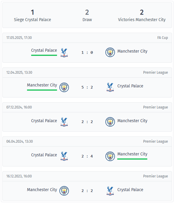 În ultimele cinci întâlniri din 2023 până în 2025, Manchester City a avut un ușor avantaj, cu două victorii, Crystal Palace a câștigat un meci, iar două s-au terminat la egalitate. Cel mai remarcabil rezultat datează din mai 2025, când Palace a câștigat finala Cupei FA cu 1-0, la doar o lună după ce City i-a învins cu 5-2 în campionat, în aprilie 2025. Golurile au fost o constantă, scorul total în această perioadă fiind de 13-9 în favoarea lui City, iar în patru meciuri s-au marcat cel puțin patru goluri. Doar finala din mai 2025 a rupt această tendință, cu un scor strâns de 1-0, iar cele două egaluri din 2023 și 2024 s-au terminat cu 2-2, ceea ce demonstrează încă o dată cât de des ambele linii ofensive reușesc să înscrie. Din punct de vedere defensiv, City a primit goluri în toate cele cinci meciuri, iar Palace în patru, ceea ce confirmă ideea unui duel deschis. Reprizele a doua au fost deosebit de animate, în patru din cele cinci întâlniri fiind marcate cel puțin două goluri, iar în trei dintre ele cel puțin trei. Palace a marcat în trei meciuri consecutive după pauză, iar City a reușit acest lucru în majoritatea întâlnirilor. În partea din Premier League a acestor dueluri recente, City este neînvinsă, cu două victorii și două egaluri, marcând cel puțin de două ori în fiecare meci. Momentul de glorie al lui Palace a fost finala Cupei FA din mai 2025, victoria cu 1-0 care a decis trofeul într-un singur meci. Este posibil ca ambele echipe să se bazeze pe aceste amintiri, City pe dominarea ligii, Palace pe dovada că le poate face rău.