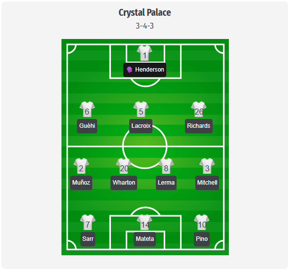Antrenor: Oliver Glasner, sistem: 3-4-3. La mijloc, Wharton și Lerma se mută în centru, în timp ce în apărare căpitanul Guéhi conduce linia de trei fundași, iar fundașii laterali Muñoz, în funcție de aliniere, pe stânga sau pe dreapta, și Mitchell ocupă pozițiile laterale. În atac, Mateta va începe probabil ca atacant central, susținut de Sarr și Pino pe aripi. Cheick Doucouré nu este eligibil pentru Conference League, ceea ce poate influența deciziile lui Glasner în ceea ce privește gestionarea efortului, iar golul lui Mitchell la Strasbourg ar putea să-i crească șansele de a fi titular sau, cel puțin, de a juca mai multe minute.