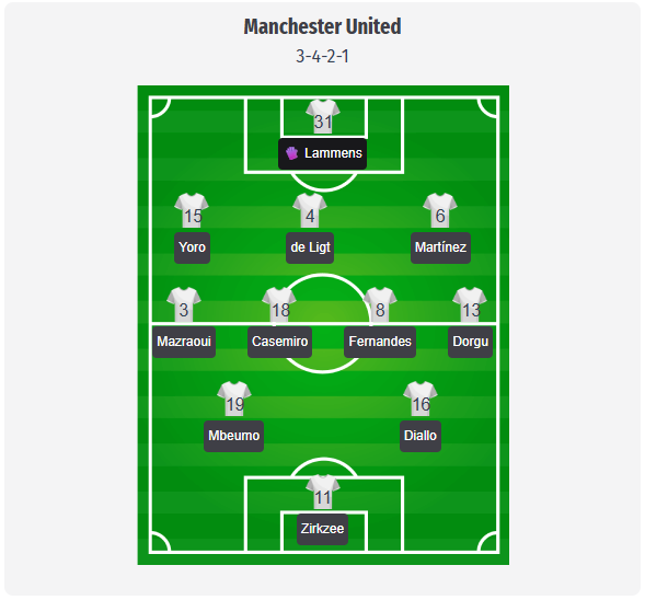 Antrenorul Rúben Amorim va păstra probabil formația de bază 3-4-2-1, deși criticile la adresa sistemului au crescut în ultima perioadă. În ofensivă lipsesc două opțiuni importante, Cunha și Sesko, iar Maguire nu este disponibil în defensivă. În fața portarului Lammens se așteaptă o linie de trei formată din Yoro, de Ligt și Martínez, iar pe pozițiile laterale ale liniei de trei sau patru ar trebui să înceapă Mazraoui și Dorgu, acesta din urmă fiind criticat recent pentru că nu a adus suficientă creativitate în atac. În mijlocul terenului, Casemiro și Fernandes sunt prevăzuți ca dublu șase, respectiv pereche centrală, iar în fața lor, Diallo și Mbeumo vor asigura creativitatea în spatele vârfului. În centrul atacului este așteptat Zirkzee, care a jucat pentru prima dată în acest sezon împotriva lui Everton și se poate recomanda cu o nouă șansă în primul unsprezece.