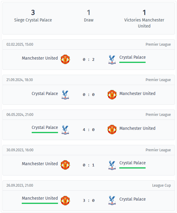 Bilanțul ultimelor cinci confruntări directe este clar în favoarea lui Crystal Palace, cu trei victorii pentru Palace, o victorie pentru Manchester United în Cupa Ligii 2023 și un egal, toate cele trei victorii ale lui Palace fiind obținute în Premier League. Deosebit de remarcabilă este înfrângerea suferită de United în februarie 2025, când Palace a câștigat cu 2-0 pe Old Trafford. Anterior, londonezii triumfaseră deja cu 4-0 în mai 2024 și cu 1-0 în septembrie 2023, doar duelul din septembrie 2024 încheindu-se fără goluri. Majoritatea acestor meciuri au fost destul de sărace în goluri, în patru din cele cinci întâlniri fiind marcate mai puțin de 3,5 goluri, iar în special reprizele a doua au adus rareori multe goluri, ceea ce indică prestații compacte și bine organizate defensiv ale Eagles. Forma actuală H2H este astfel un argument clar în favoarea lui Crystal Palace, United având dificultăți în ultima perioadă în a găsi soluții împotriva stilului de joc compact al londonezilor, ceea ce joacă un rol important atât pentru evaluarea sportivă, cât și pentru posibile considerente tactice și decizii de pariere.