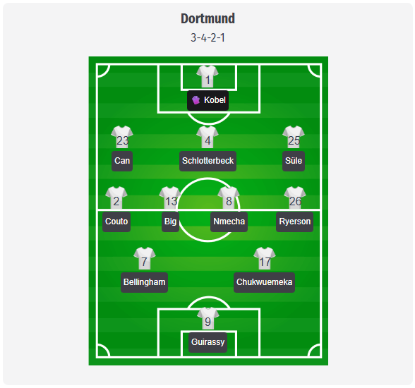 Pentru meciul de acasă împotriva lui Gladbach, Borussia Dortmund, sub conducerea lui Kovac, ar trebui să rămână la formația familiară 3 4 2 1, cu Kobel în poartă, în spatele unei linii de trei formate din Schlotterbeck, Can și Süle. Couto și Ryerson ar juca ca fundași laterali, în timp ce Groß și Nmecha ar ocupa mijlocul central. Bellingham și Chukwuemeka ar trebui să-l susțină pe Guirassy în rolul de atacant central. Acestea sunt în continuare previziuni, nu formații confirmate. În apărare, Anton și Anselmino au accidentări la coapsă, Bensebaini este la echipa națională, iar Mane este bolnav, ceea ce înseamnă că efectivul din spatele liniei de trei fundași ar fi destul de redus. Mai în față, Brandt are probleme la gleznă, iar Sabitzer are probleme musculare, astfel încât Groß, Nmecha, Bellingham și Chukwuemeka vor trebui probabil să preia cea mai mare parte a muncii creative în spatele lui Guirassy.