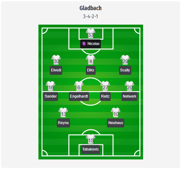 Gladbach va juca probabil sub conducerea lui Polanski în formația 3 4 2 1 cu care s-a obișnuit, cu Nicolas în poartă, în spatele unei linii de trei formate din Diks, Elvedi și Scally, proaspăt revenit după suspendarea din campionat. Netz și Sander ar trebui să joace ca fundași laterali, în timp ce Engelhardt și Reitz vor asigura stabilitatea în mijlocul terenului, având în vedere absența lui Chiarodia și Friedrich și alternativele limitate în apărarea centrală. În zona ofensivă, Neuhaus, recent revenit după probleme musculare, este așteptat în formația de start prevăzută alături de Reyna ca mijlocaș mai avansat, în spatele lui Tabakovic, care ar continua să joace ca singurul atacant. Pe flancuri, opțiunile sunt limitate, deoarece Honorat, Hack și Ngoumou sunt indisponibili, iar Kleindienst și Urbich nu sunt disponibili. Machino, care a lipsit la începutul săptămânii, ar putea intra doar de pe banca de rezerve. Este vorba, în ansamblu, de o formație prevăzută, nu de o confirmare oficială.