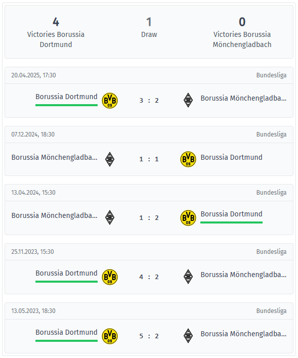 În ultimele cinci dueluri din Bundesliga din 2023, Dortmund este neînvinsă, cu patru victorii și un egal împotriva Mönchengladbach. Ultima confruntare, din aprilie 2025, s-a încheiat cu 3-2 în favoarea Dortmundului, după ce echipa a făcut din nou diferența în atac, deși a primit două goluri. Bilanțul actual este clar în favoarea echipei lui Niko Kovac. Avantajul terenului propriu a fost evident: în 2023 și din nou în aprilie 2025, Dortmund a primit Gladbach de trei ori și a câștigat cu 5-2, 4-2 și 3-2, marcând de fiecare dată cel puțin de trei ori și primind întotdeauna două goluri. În schimb, cele două deplasări la Mönchengladbach în 2024 au adus o victorie la limită cu 2-1 și un egal 1-1, astfel încât diferența în afara Signal Iduna Park se micșorează. Meciurile au fost în mod constant bogate în goluri. În cele cinci meciuri s-au marcat în total 23 de goluri, 15 pentru Dortmund și 8 pentru Gladbach, cu o medie de 4,6 pe meci. Toate meciurile au depășit 1,5 goluri, iar patru s-au încheiat cu cel puțin trei goluri. În toate cele cinci meciuri, ambele echipe au marcat, astfel încât în această serie recentă nu a existat niciun meci în care o echipă să nu fi primit gol. Un alt model clar se conturează în jurul pauzei: Dortmund a condus la pauză în patru din cele cinci meciuri și nu a fost niciodată în urmă, în timp ce Gladbach nu a marcat în această perioadă înainte de pauză. Toate golurile Gladbachului au fost marcate după pauză, ceea ce sugerează că meciurile se deschid mai târziu, după ce Dortmund s-a impus devreme. În această perioadă, Dortmund a înregistrat o serie de trei victorii între 2023 și prima întâlnire din 2024, ceea ce a însemnat, în mod natural, trei înfrângeri consecutive pentru Gladbach. Împreună cu actuala serie de cinci meciuri fără înfrângere și cinci întâlniri consecutive în care ambele echipe au marcat, avantajul psihologic ar putea fi acum de partea Dortmundului înainte de următorul capitol.