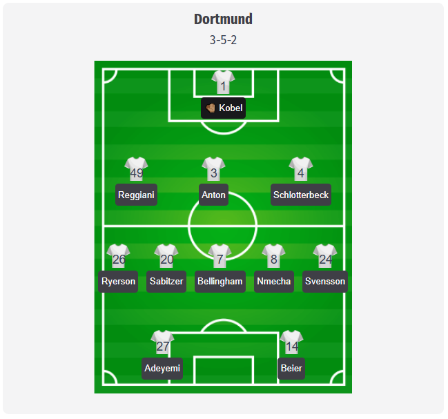 Borussia Dortmund va juca probabil, dar nu este confirmat, sub conducerea lui Niko Kovac într-un 3-5-2, cu Gregor Kobel – 1 în spatele lui Luca Reggiani – 49, Waldemar Anton – 3 și Nico Schlotterbeck – 4.