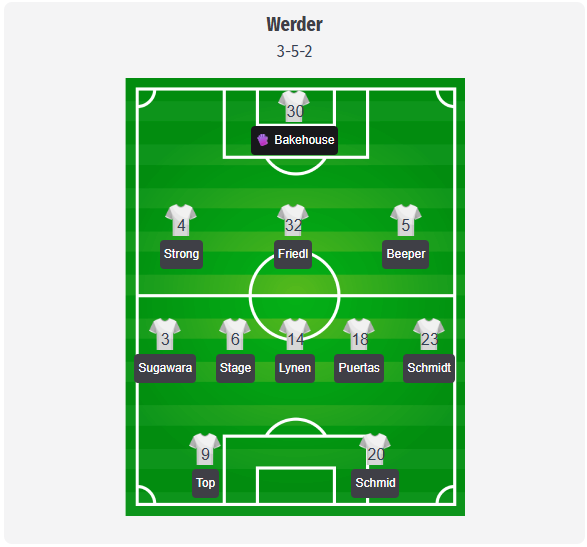 Steffen ar trebui să rămână la sistemul 3-5-2 ușor modificat, cu Backhaus ca titular probabil în spatele unei linii de trei formate din Stark, Friedl și Pieper. Totul ar trebui să vină din partea mijlocașilor Sugawara și Schmidt, care vor deschide terenul, în timp ce Lynen va ține mijlocul și Stage va asigura presiunea cu alergările sale între careurile de pedeapsă. Puertas pare a fi jucătorul de legătură evident în linia de atac. În față, Topp este planificat ca titular, Schmid are în prezent un ușor avantaj pentru rolul de al doilea atacant, chiar dacă Njinmah ar fi o opțiune cu mai multe sprinturi în adâncime. Boniface este indisponibil după o operație la genunchi, Milosevic are o mână fracturată, așa că selecția este limitată. Weiser și Agu continuă să lipsească pe flancuri, iar problemele musculare ale lui Wöbers nu permit prea multe opțiuni de rotație în linia de trei fundași.