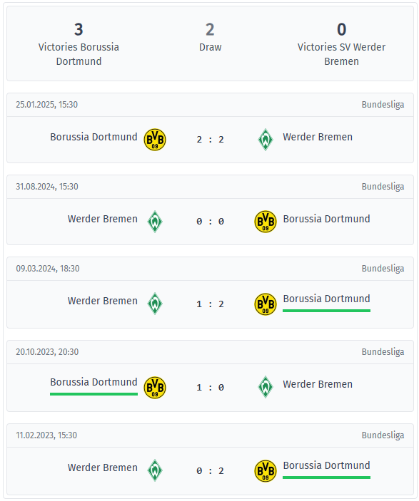 Dortmund – Werder Comparație directă și statistici
