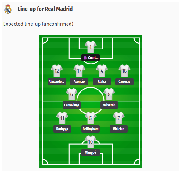 Real Madrid va juca probabil la Elche în formația obișnuită 4-2-3-1, dar problemele de personal din apărare îl obligă pe Xabi Alonso să improvizeze soluții. În apărarea centrală lipsesc Militão, Rüdiger și Carvajal, motiv pentru care tânărul Asencio ar putea începe alături de Alaba. De asemenea, există un optimism moderat că Tchouaméni se va întoarce la antrenamente după accidentare și, dacă va fi necesar, va putea ajuta chiar și ca fundaș central.