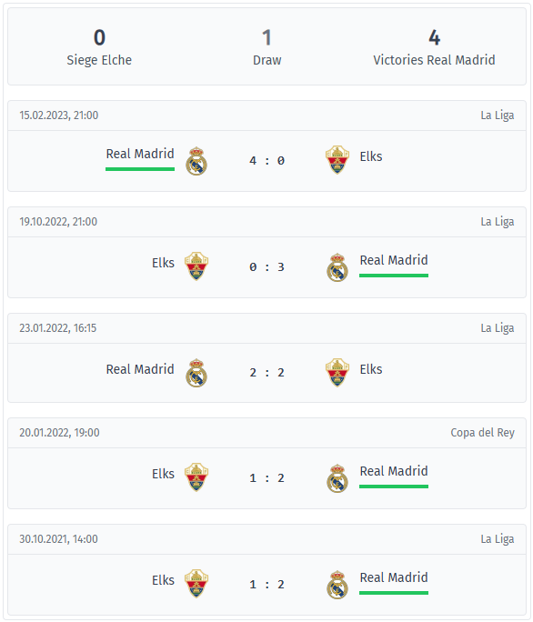 Comparația directă este clar în favoarea Real Madrid, care a obținut patru victorii și un egal în ultimele cinci întâlniri. Elche așteaptă cel puțin din 2021 o victorie împotriva Realului, fiind deosebit de clare scorurile de 4-0 din februarie 2023 și 3-0 din Elche, din octombrie 2022.
