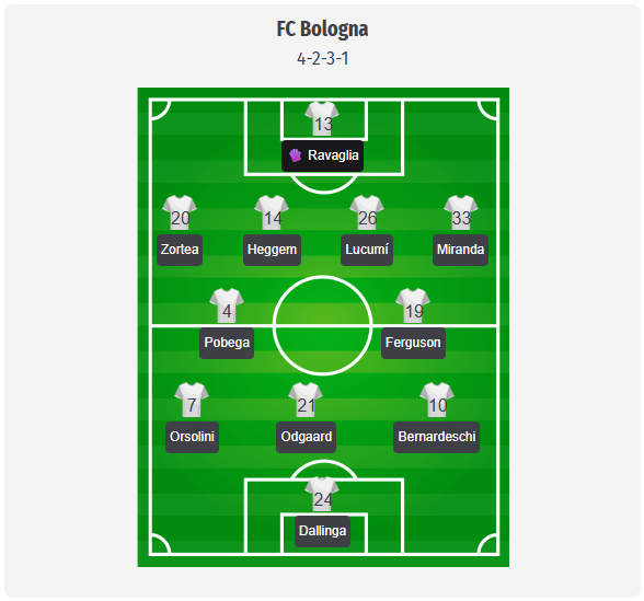 Bologna va juca probabil în formația obișnuită 4-2-3-1, dar va trebui să înlocuiască mai mulți jucători cheie. Portarul titular Skorupski lipsește, la fel ca și Remo Freuler, care are o fractură de claviculă, astfel că Todor Ravaglia va fi probabil titular în poartă. Pe aripi, Rowe și Cambiaghi, care ar fi trebuit să-l înlocuiască pe Aaron Hickey, nu sunt disponibili, astfel încât Bologna va trebui să se bazeze pe alternative din lot. În mijlocul defensiv, dubla de mijlocași va trebui să mențină stabilitatea, deoarece absența lui Freuler afectează atât creativitatea, cât și munca defensivă. În atac, Federico Bernardeschi ar putea juca un rol important după cele două goluri marcate recent și ar putea acționa ca punct central de referință în spatele atacului, iar în centrul atacului se așteaptă ca Joshua Dallinga să fie preferat. În ansamblu, formația rămâne nominal aceeași, dar lipsa de personal, în special în poartă, în mijlocul terenului și pe aripi, poate limita stilul de joc și variabilitatea lui Bologna, Bernardeschi și Dallinga având acum o responsabilitate și mai mare pentru forța ofensivă.