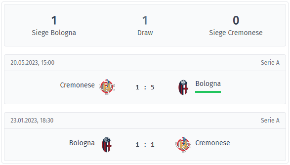 Ultimele două întâlniri dintre Bologna și Cremonese au avut loc în 2023 în Serie A, Bologna rămânând neînvinsă și obținând o victorie clară cu 5-1 la Cremona și un 1-1 pe stadionul propriu, Stadio Renato Dall’Ara. Meciul din deplasare de la Cremona s-a încheiat surprinzător de clar, cu 5-1 pentru Bologna. Este de remarcat faptul că în ambele partide repriza a doua a fost mult mai bogată în goluri, iar ambele echipe au marcat. Pentru Cremonese, obiectivul principal este acum să obțină pentru prima dată puncte împotriva Bologna în istoria recentă a duelurilor dintre cele două echipe, amintirile pozitive fiind mai degrabă legate de egalul 1-1 de la Bologna decât de înfrângerea cu 5-1 suferită acasă împotriva Rossoblù.