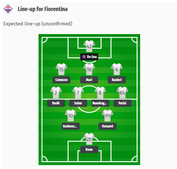 Antrenorul Stefano Pioli ar trebui să alinieze obișnuitul sistem 3-4-2-1. În defensivă, Robin Gosens lipsește din cauza problemelor la coapsă, iar Tariq Lamptey nu este disponibil după ruptura de ligament. Pe partea stângă a liniei de trei fundași ar putea juca Fabiano Parisi, iar pe dreapta se preconizează că va juca Dodô. Mattia Viti ar putea fi teoretic o opțiune din nou, în ciuda suspendării sale recente, dar Pioli ar putea prefera mai degrabă linia de trei fundași cu Comuzzo, Marí și Ranieri. În mijlocul terenului vor juca probabil Sohm și Mandragora. În atac, în spatele singurului atacant Kean, Guðmundsson și Kouamé ar putea aduce impulsuri creative.