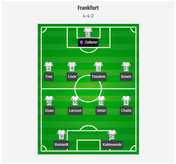 Posibilă formație a lui Eintracht (nu este o formație oficială): 4-4-2 cu Michael Zetterer (23) în poartă; apărare: Elias Baum (2), Robin Koch (4), Arthur Theate (3), Nathaniel Brown (21). Din cauza absențelor lui Nnamdi Collins și Rasmus Kristensen, linia de patru ar putea fi soluția cea mai pragmatică. Pe aripi, Ritsu Doan (20) și Farès Chaïbi (8), în centru Hugo Larsson (16) și Ellyes Skhiri (15). Jean-Mattéo Bahoya și Michy Batshuayi sunt indisponibili, așa că un duo de atac format din Jonathan Burkardt (9) și Arnaud Kalimuendo (25) ar fi o alegere logică.