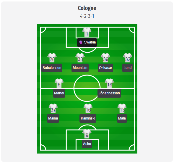 Echipă probabilă 1. FC Köln (prognoză, nu este lotul oficial): 4-2-3-1 cu Marvin Schwäbe 1 în poartă; apărare: Sebastian Sebulonsen (28), Rav van den Berg (33), Cenk Özkacar (39), Kristoffer Lund (32). La mijlocul defensiv, Eric Martel (6) și Ísak Jóhannesson (18) — trebuie luată în considerare suspendarea lui Martel; Tom Krauß este indisponibil. În atac, Linton Maina (37), Jakub Kamiński (16) și Said El Mala (13) ca sprijin pentru Ragnar Ache (9). Alessio Castro-Montes nu este nici el apt de joc, ceea ce face mai probabilă prezența lui Sebulonsen pe postul de fundaș lateral dreapta.