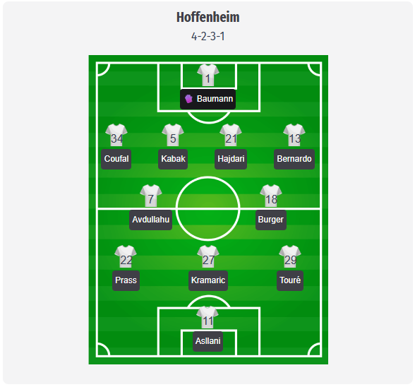 Ilzer ar trebui să mizeze din nou pe obișnuitul său 4-2-3-1. Probabilul unsprezece de start: Baumann (portar); Coufal, Kabak, Hajdari, Bernardo (apărare); Avdullahu și Burger (dublu șase); Prass, Kramaric și Touré (mijloc ofensiv); Asllani (atac).
