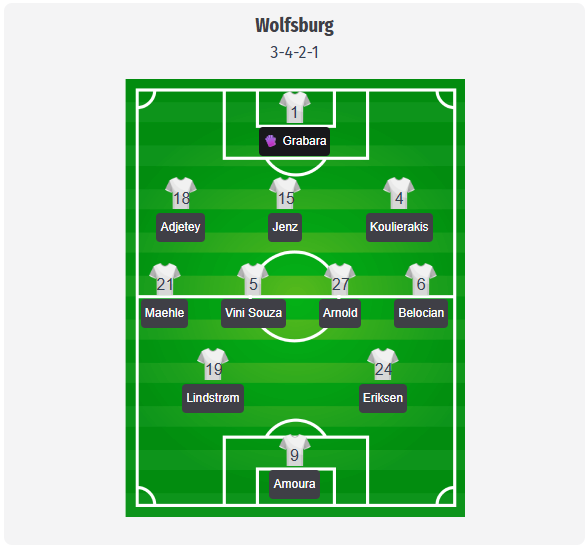 Hlozek este în continuare indisponibil din cauza unei accidentări la gambă, iar Machida și Gendrey lipsesc și ei din defensivă. Acestea sunt lipsuri simțite, dar lățimea lotului îi oferă lui Ilzer suficient spațiu de manevră pentru a face față situației, mai ales că Wolfsburg are în prezent probleme în a alinia o linie defensivă stabilă.