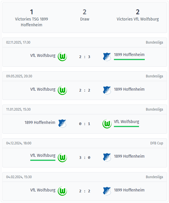 În ultimele cinci confruntări, Wolfsburg are un ușor avantaj cu două victorii, Hoffenheim a câștigat o dată, iar de două ori echipele au terminat la egalitate. Bilanțul este, așadar, destul de echilibrat. Ultima întâlnire din Bundesliga, din noiembrie 2025, a fost câștigată de Hoffenheim, care a transformat un deficit la Wolfsburg într-o victorie în deplasare cu 2-3.