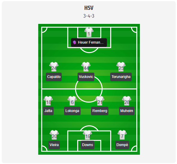Polzin ar trebui să rămână la formația cu trei fundași și să construiască o formație de bază cu 3 în apărare, 4 la mijloc și 3 în atac. Heuer Fernandes ar trebui să înceapă în spatele lui Capaldo, Vuskovic și Torunarigha, alături de Jatta și Muheim ca fundași laterali agresivi. Lokonga și Remberg par a fi cei mai potriviți pentru rolul de dublu șase, astfel încât Vieira să poată trage spre interior în spațiile libere din spatele lui Downs și Dompé. În față, prognoza este marcată de absențe. Glatzel este în continuare indisponibil din cauza unei rupturi musculare, iar Poulsen rămâne pe tușă din cauza unei accidentări la gleznă, astfel că Downs este candidatul evident pentru vârf, Königsdörffer fiind o alternativă de pe bancă. În defensivă, Omari nu este disponibil, Soumahoro este incert, iar Elfadli este suspendat după cartonașul roșu primit la Freiburg.