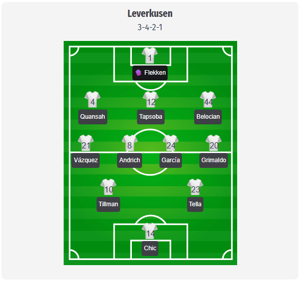 Hjulmand ar trebui să mizeze, ca de obicei, pe formația 3-4-2-1, cu Flekken în spatele unei linii de trei formate din Quansah, Tapsoba și Belocian. Echilibrul ar trebui să vină de la Grimaldo și Vázquez, care vor deschide jocul pe aripi, în timp ce Andrich și García vor dicta ritmul în centrul terenului. În spatele lui Schick, Tillman și Tella sunt probabil cel mai probabil duo între linii. Poku și Maza sunt alternative. Selecția este marcată de absențe: Palacios, Hofmann, Terrier și Sarco nu sunt în prezent eligibili pentru meciurile din Liga Campionilor, Ben Seghir este plecat cu naționala, iar Kofane joacă cu Camerun la AFCON. Prin urmare, Tillman are o responsabilitate și mai mare de a face legătura între mijlocul terenului și atac, iar Schick trebuie să finalizeze fazele de tranziție. Dacă Hjulmand dorește mai multă stabilitate, Badé ar putea intra în joc, iar Fernández este o alternativă pentru mijlocul terenului.