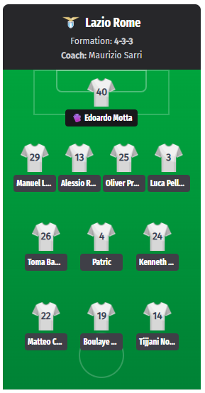 Lazio Roma ar trebui să rămână la formația obișnuită a lui Maurizio Sarri, cu o linie de patru fundași, un mijloc cu trei jucători și un atac cu trei jucători. Este doar o previziune, dar Edoardo Motta – 40 ar putea rămâne în poartă atâta timp cât Ivan Provedel este accidentat. Întrucât Mario Gila și Samuel Gigot sunt indisponibili, Adam Marusic – 77, Patric – 4, Alessio Romagnoli – 13 și Nuno Tavares – 17 par a fi cea mai probabilă linie defensivă.