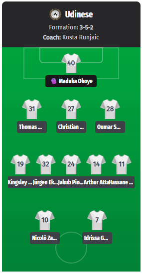 Udinese Calcio ar trebui să joace din nou în formația 3-4-2-1, deși aceasta este doar o previziune și nu o echipă de start confirmată. Probabila linie de trei fundași va fi formată din Thomas Kristensen (31), Christian Kabasele (27) și Oumar Solet (28), în fața lui Maduka Okoye (40). Având în vedere că Nicolò Bertola este accidentat, această structură defensivă pare încă o dată cea mai evidentă opțiune.